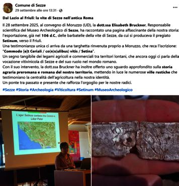 Il convegno, pianificato e organizzato dal Comune di Moruzzo col supporto finanziario della Regione FVG in seno al progetto divulgativo “Appunti di storia. Dagli scavi di Moruzzo testimonianze sulla viticoltura di duemila anni fa”, ha destato grande interesse per i contenuti scientifici e le testimonianze inedite presentate. Nell’aprire i lavori, il sindaco Roberto Pirrò, dopo aver portato il saluto del suo omologo primo cittadino di Sezze, Lidano Lucidi (trattenuto a Latina da un evento concomitante), ha ricordato l’origine dell’iniziativa, legata ai ritrovamenti di epoca romana nella campagna di scavi condotta anni orsono nel territorio di Moruzzo a cura della Società Friulana di Archeologia, sotto l’egida e la supervisione della Soprintendenza ABAP per il FVG.