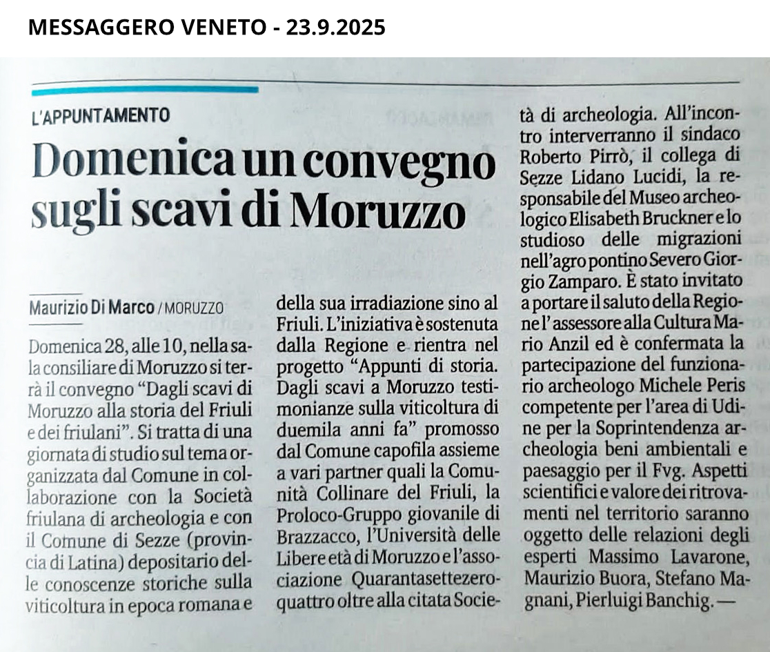 Mentre prosegue l’iter burocratico per arrivare verso fine anno all’esposizione museale dei preziosi reperti archeologici emersi dalla campagna di scavi del 2011-2018, è confermata per il 28 settembre nella sala del Consiglio comunale di Moruzzo la Giornata di studio sul tema, organizzata in collaborazione con la Società Friulana di Archeologia e con il Comune di Sezze (provincia di Latina), depositario delle conoscenze storiche sulla viticoltura in epoca romana e della sua irradiazione sino al Friuli.